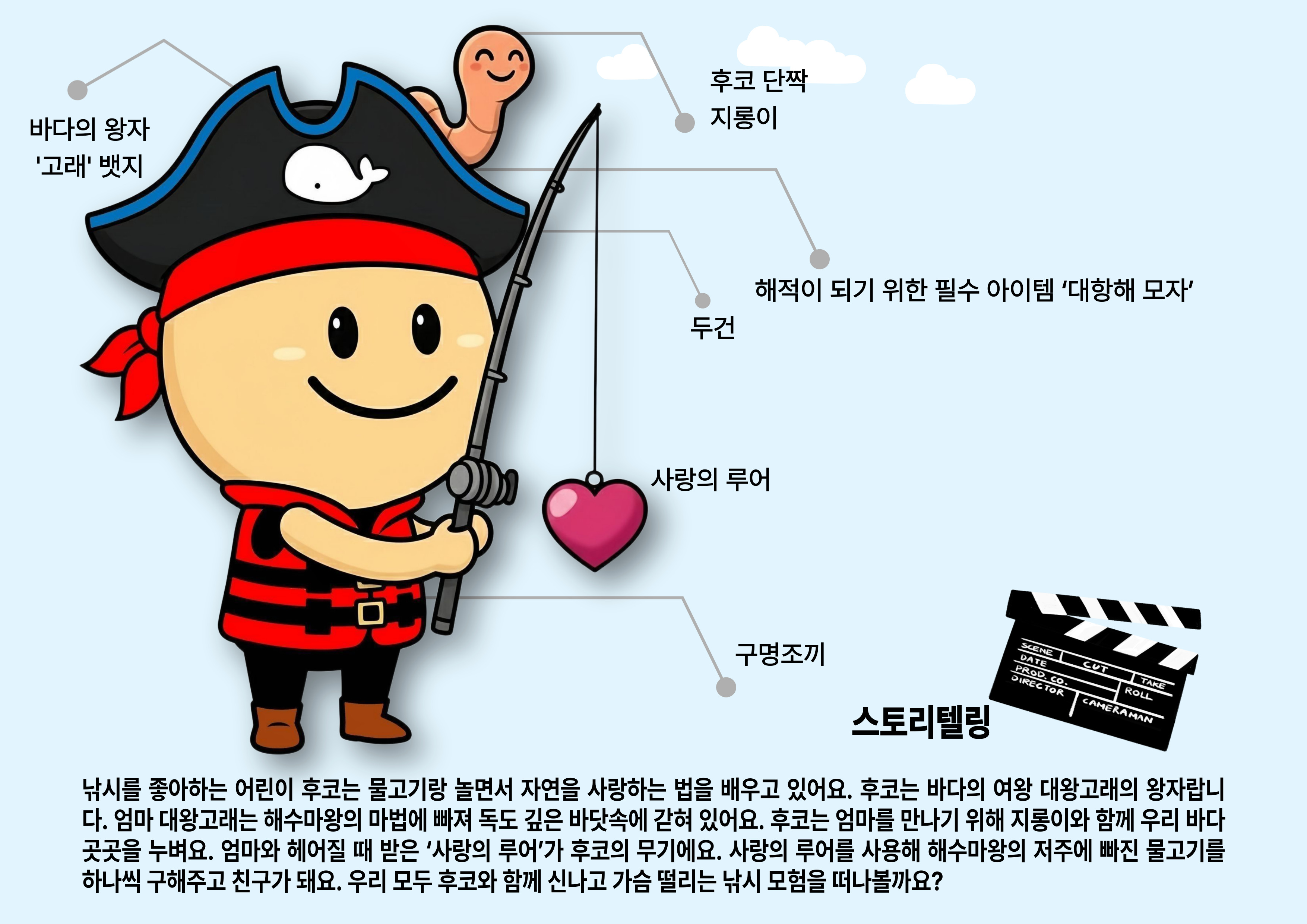 저는 바다의 여왕 대왕고래 엄마를 만나기 위해 단짝 지렁이와 함께 우리 바다 곳곳을 여행하고 있어요. 낚싯대 끝에 달린 ‘사랑의 루어’로 저주에 걸린 물고기들을 하나씩 구해주며 친구가 되는 게 제 가장 큰 모험이랍니다!
